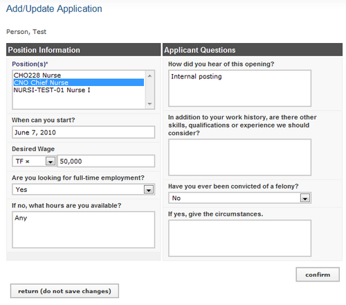 Make certain that a position has been selected for the application. The position is required. Other applicant questions may also be required. All required fields are outlined in red. Fill in the missing information and try saving again. If you do not want to add an application after all, click Return (do not save changes).