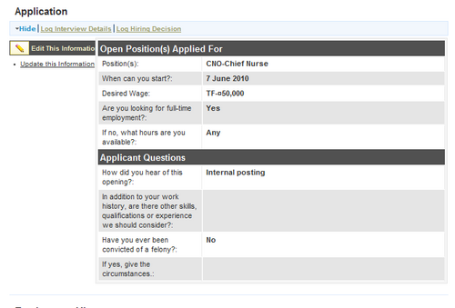 The completed application displays in the person's record. Now managers and HR personnel can review the application, make notes about the interview process and hiring decision, and make a job offer to the applicant. The application will remain on file even after the position is filled, but it can be updated at any time by clicking Update This Information.