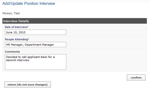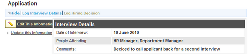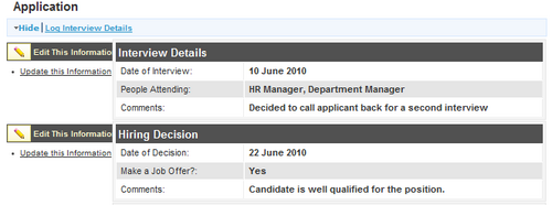 The details of each interview are displayed in the person's record under the "Application" section and can be reviewed at any time. Update these details by clicking Update This Information.