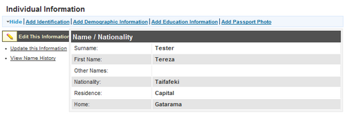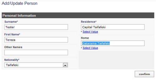 Open the person's record and click Update This Information beside the "Name/Nationality" section. Make any changes and click Confirm to save them. The updated information will appear in the person's main record. If the change was to the person's name, all previous names are retained by the system and can be viewed by clicking View Name History.