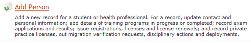Click Add Person to add a new record for a student or health professional. For each record, you can update contact and personal information; add details of training programs in progress or completed; record exam applications and results; issue registrations, licenses and license renewals; and record private practice licenses, out migration verification requests, disciplinary actions and deployments.