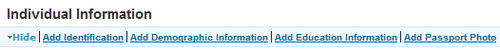 In the record under the "Individual Information" section, click Add Demographic Information. All demographic information is optional. File:QAddPassportPhoto1_405.png