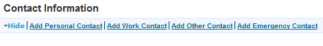 For each person in the system, whether an employee or a job applicant, four types of contact information may be added: personal, or home, contact; work contact; emergency contact; and other contact. Only one contact may be added for each type. Contact information may be added at any time after the record is created. All contact fields are optional.